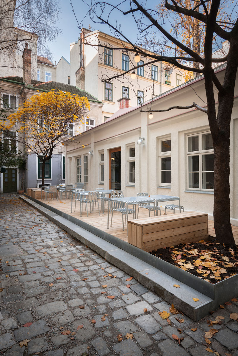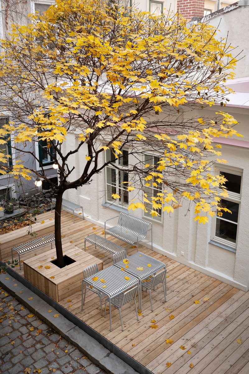 genannt - ist ein wahres Juwel. Die städtische Atmosphäre, der Schutz des Innenhofs, die großen alten Bäume und dazu kombiniert ein schlichtes Holzdeck und einfaches Mobiliar aus verzinktem Stahl - der Sommer kann kommen!