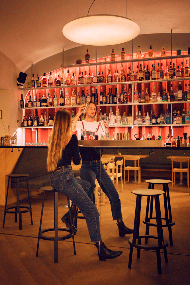 zwischen Gastraum und Bar treffen die beiden unterschiedlichen Gestaltungswelten direkt aufeinander - und sorgen für unerwartete visuelle Effekte.