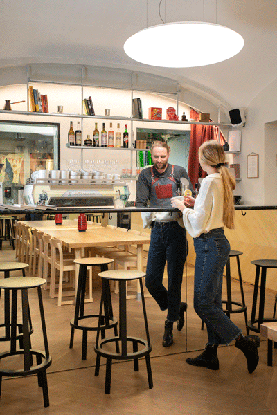 begrüßt einen der Barista mit einem frischgebrühten Kaffee aus der künstlerisch bemalten Espressomaschine. Die Vorhänge sind geöffnet und Einblicke in die Küche erlaubt und sogar gewünscht. Auch tagsüber verschmelzen im Café Kandl Gast und Gastgeber zu einem.