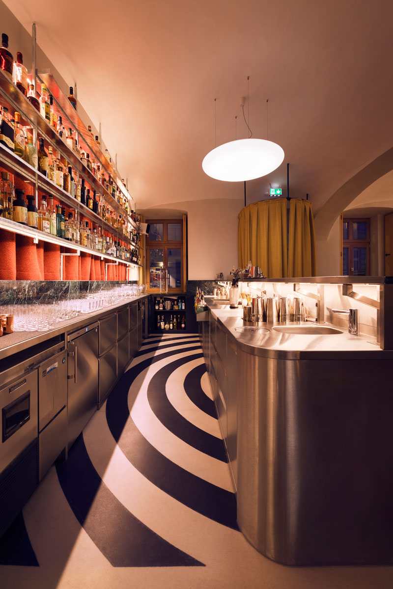 ist richtig was los. Das quadratische Parkettmuster transformiert hier zum schwarz-weißen Kreismuster. Der schwere rote Vorhang sorgt nicht nur für angenehme Akustik. Zusammen mit dem grünen Marmor schafft er auch das perfekte Bühnenbild für die famosen Barkeeper und ihre Drinks. Glänzender Edelstahl und blitzender verzinkter Stahl ergänzen das Bild.