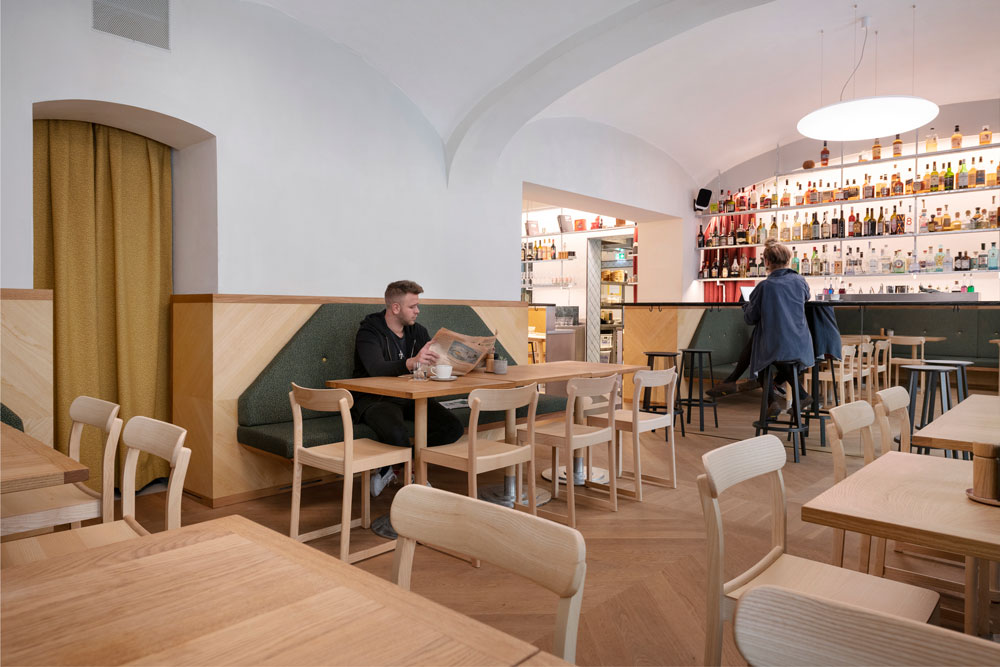orientiert sich mit dem Eichenparkett und den Holzvertäfelungen aus Esche sowie der dazu passenden Möblierung an klassischen Kaffeehäusern. Die grafische Gestaltung des verlegten Holzes in Kombination mit den farbigen Stoffen von Vorhängen und Sitzpolstern bringt jedoch die nötige Frische in ein altbewährtes Konzept.