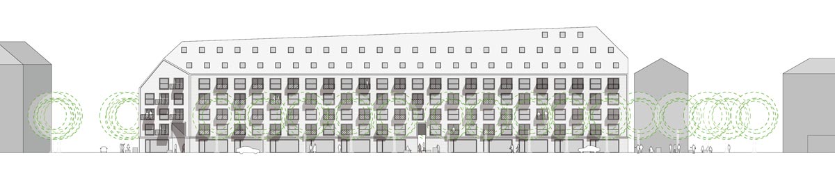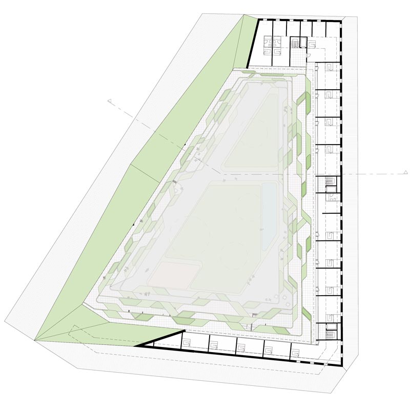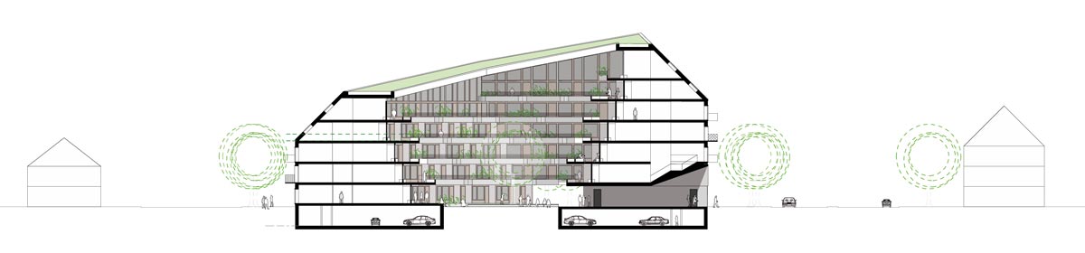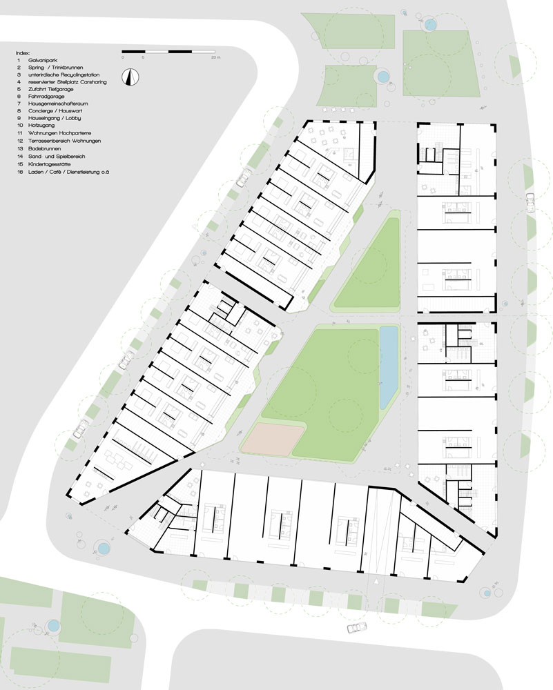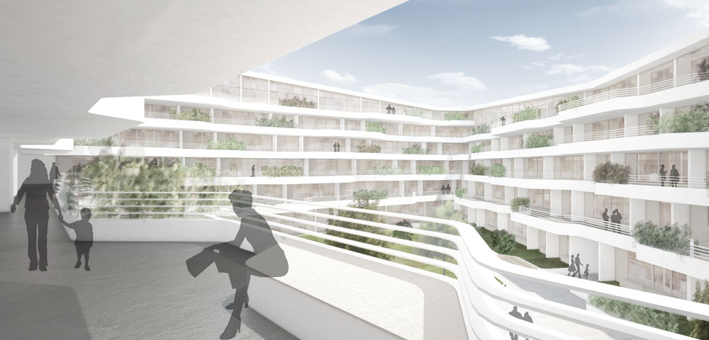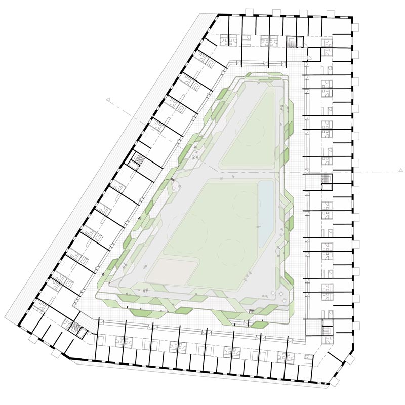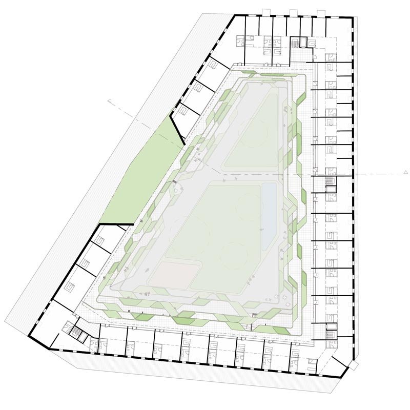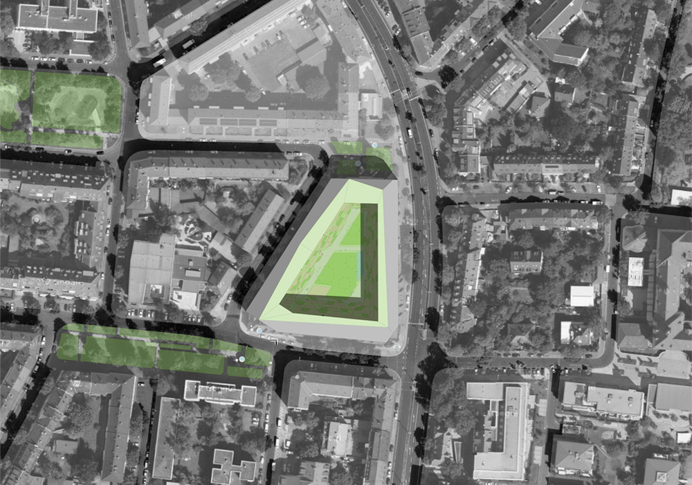 reagiert auf das Defizit an Grünflächen und wird zur grünen Oase für die Hausgemeinschaft. Die Terrassierung der Fassaden schafft ideale Belichtungsverhältnisse für die Hoffläche bei maximaler Flächennutzung. Zusätzlich entstehen großzügige Terrassenflächen über alle Geschosse die zusammen mit der Hoffläche zu einem großen Garten für Alle werden.