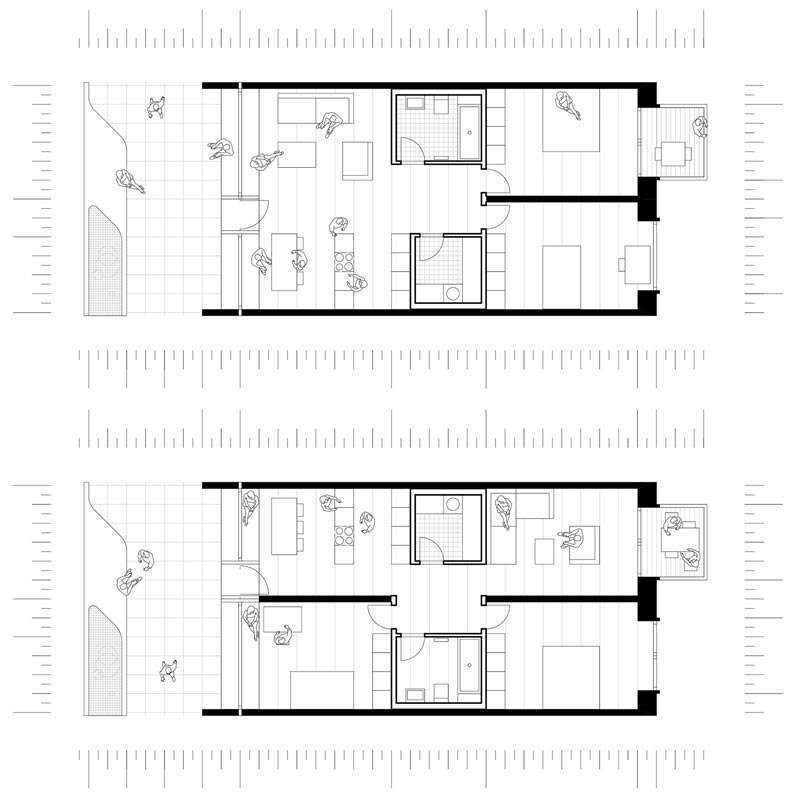 Innerhalb einer Achse lassen sich Zweizimmerwohnungen, innerhalb von zwei Achsen Drei- bis Vierzimmerwohnungen nach Wunsch einfügen. Eine sinnvolle Differenzierung der Wohnungsgrößen für ein breitgefächertes Angebot erfolgt über die Staffelung der Ebenen zum Innenhof.