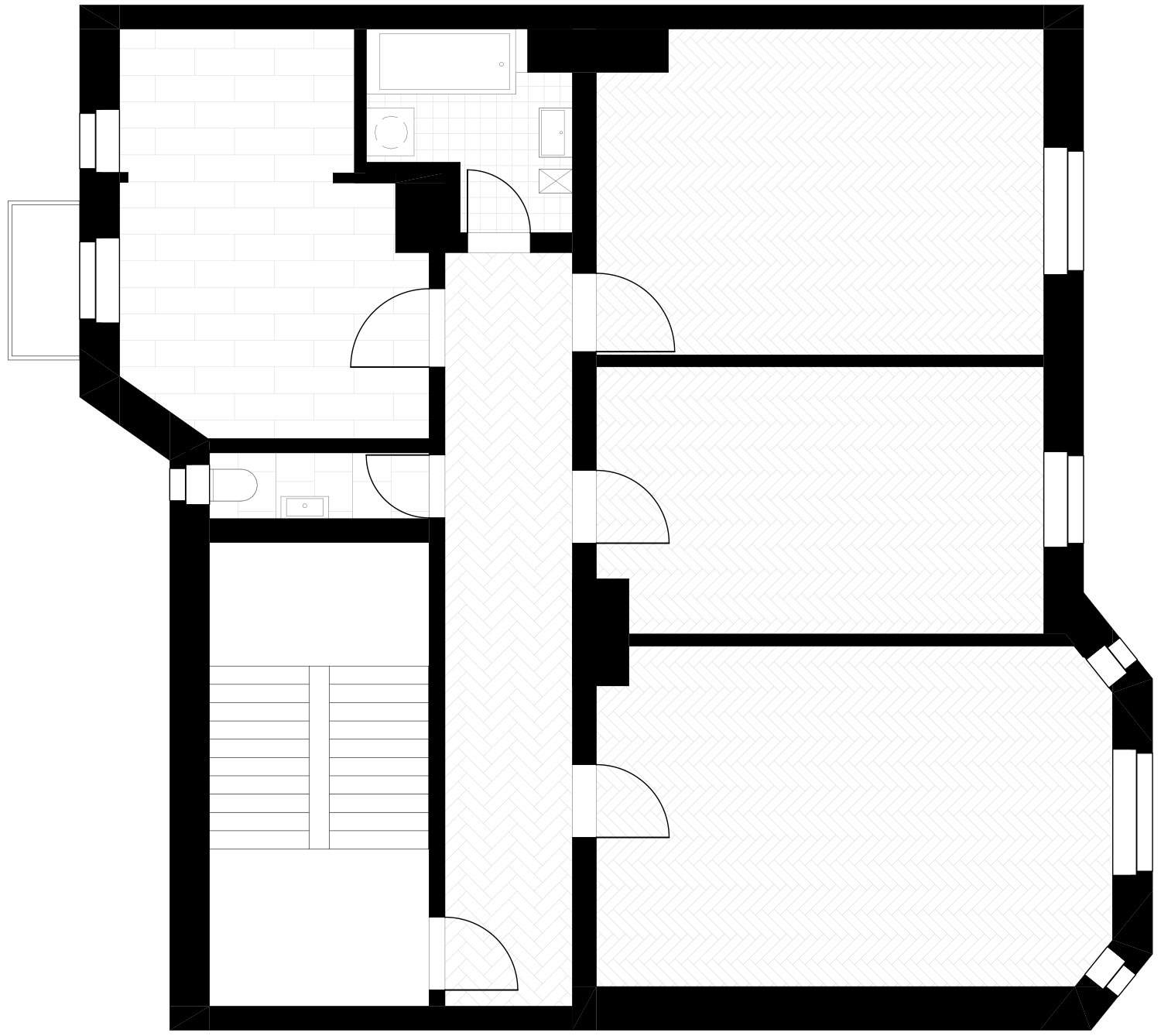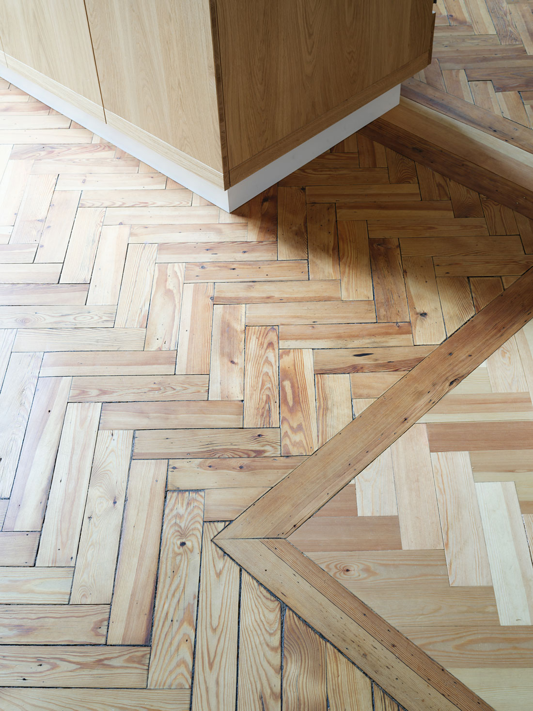 aus Kiefer wurde unter vielen Lagen anderer Böden entdeckt. An Stellen wo früher Wände oder der Holzofen stand, wurde dieses mit neuem Material ergänzt, was sich nun wunderbar am Boden abzeichnet. Ansonsten reichte es, das Parkett abzuschleifen und mit Hartöl einzulassen.