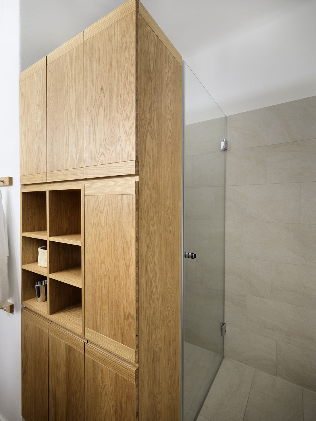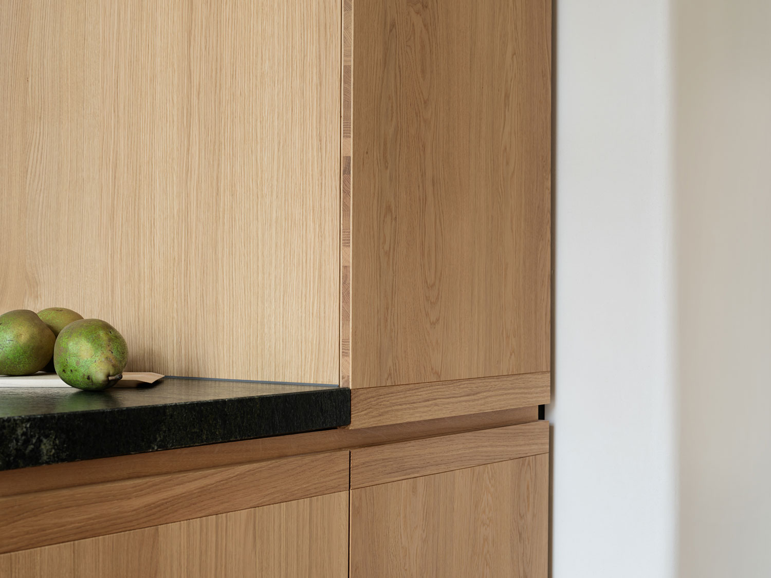 gestaltet, die sich handwerklich sauber gefügt, als klare Linie durch alle Einbaumöbel ziehen.