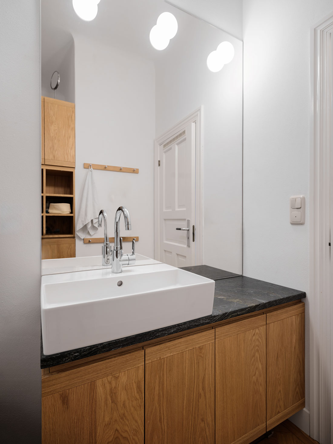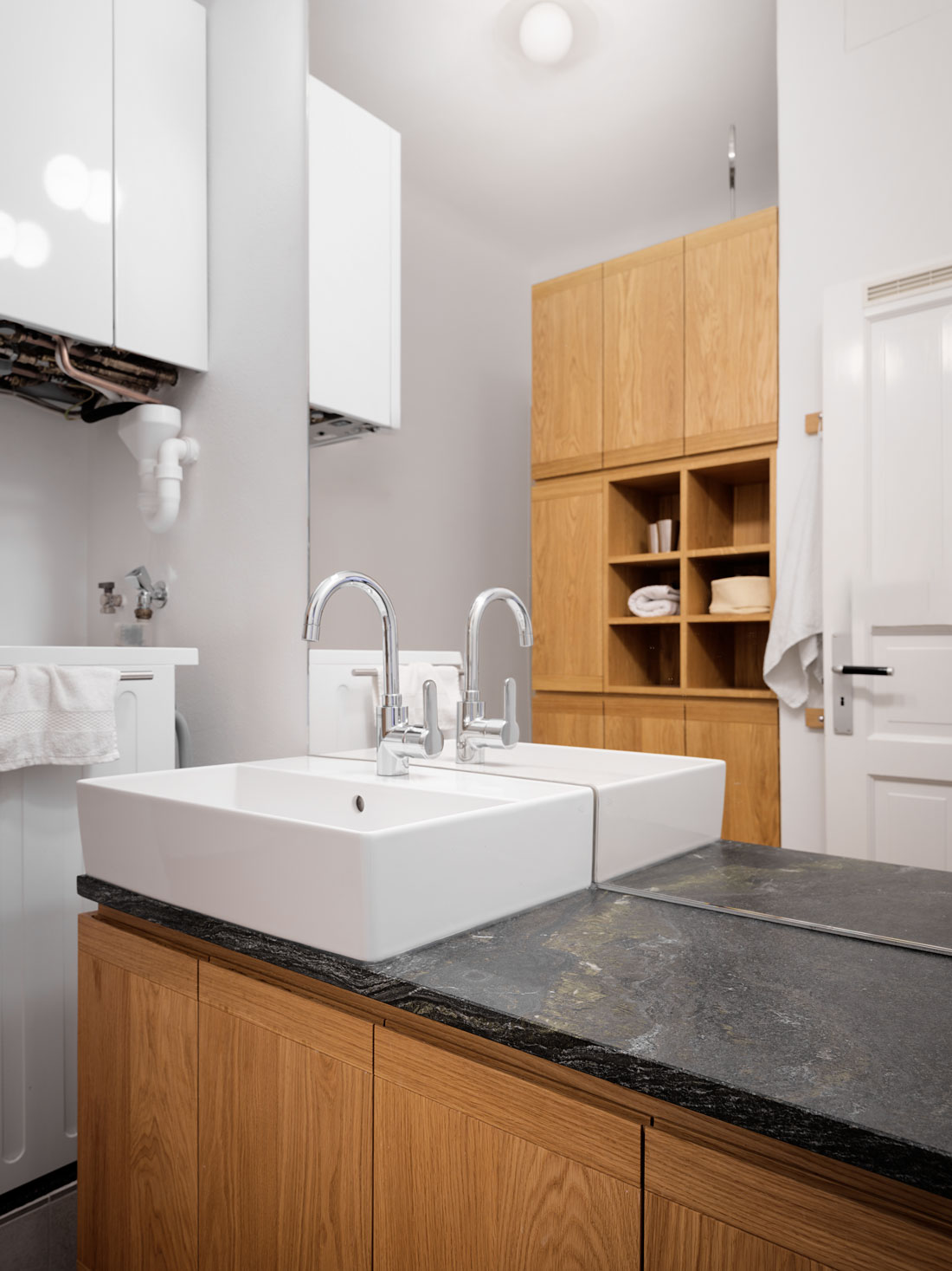wurde mit einem Einbauwaschtisch aus Eiche und Granit im Stil der Küche neu gestaltet.