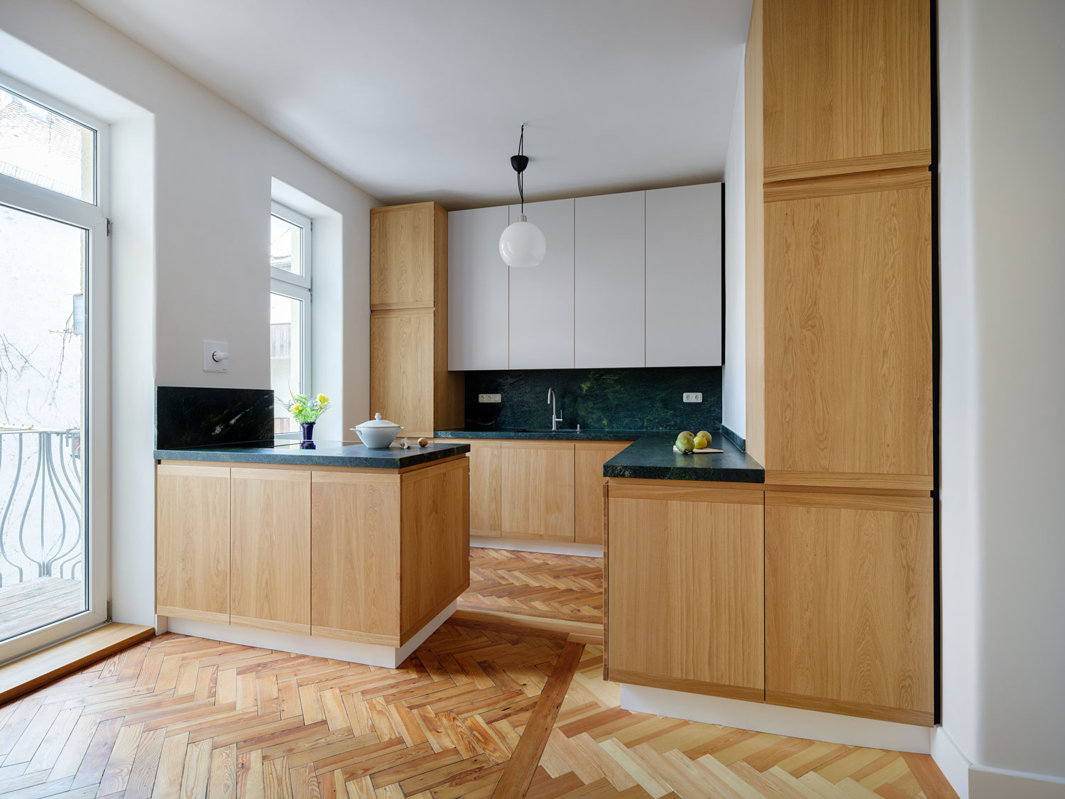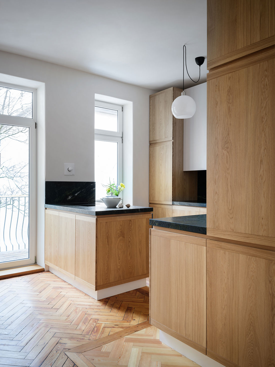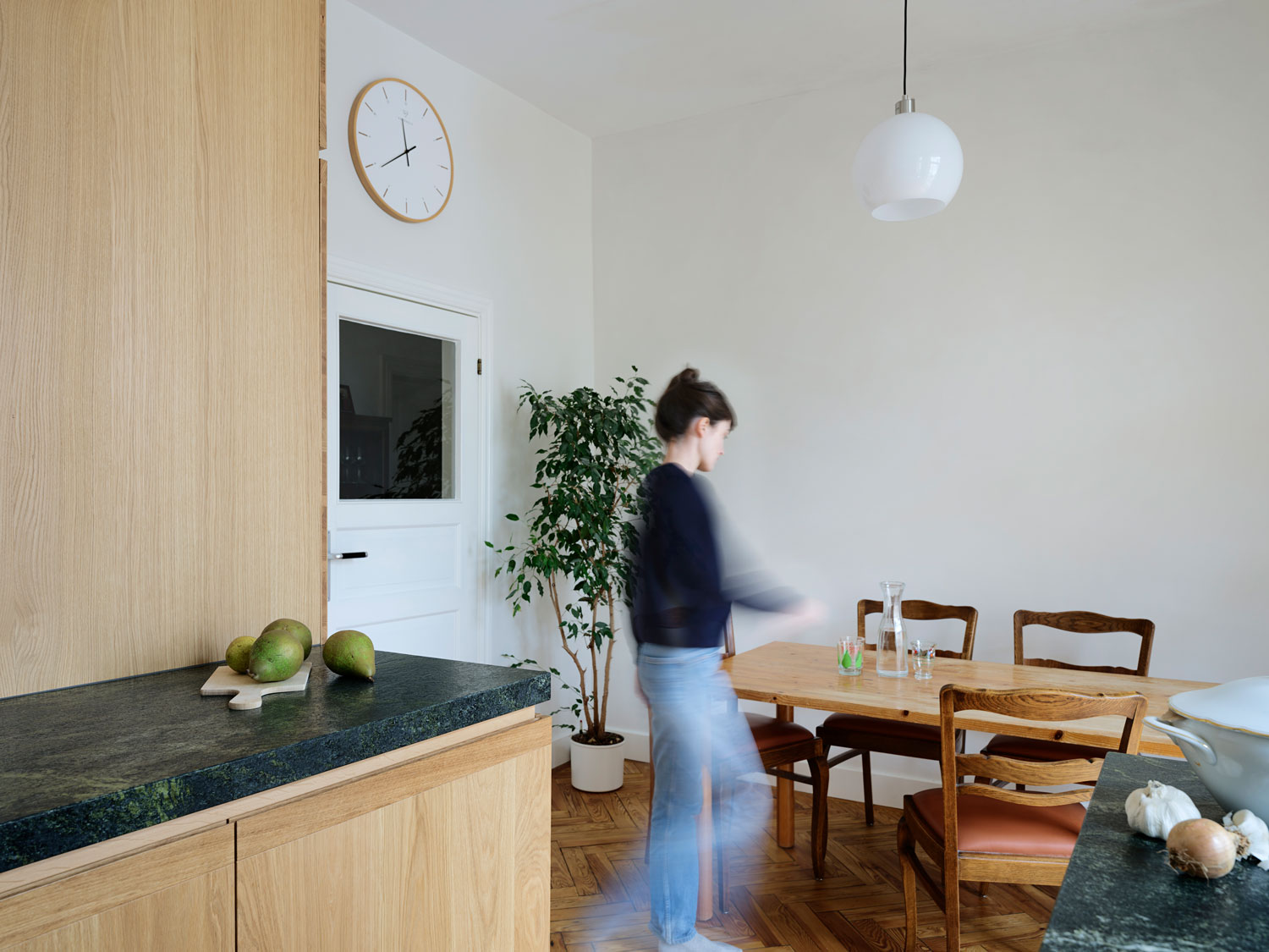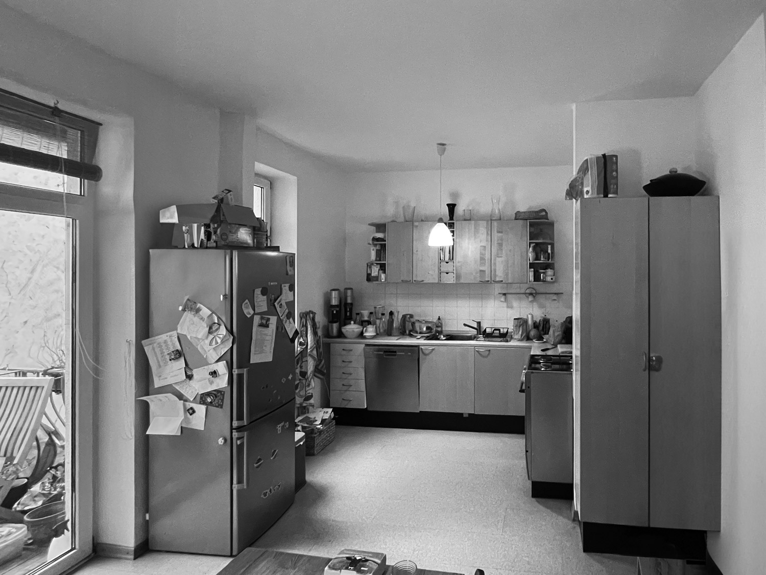 Viele Familien in großen Städten teilen das gleiche Problem. Die Wohnung hat ein Zimmer zu wenig, aber ein Umzug ist zu teuer. Wenn dann auch noch der Denkmalschutz größeren Lösungen nicht zustimmt, müssen pragmatische Lösungen gefunden werden. Die Küche ist bei fast allen Familien der Mittelpunkt des Lebens. Hier wird gegessen und getrunken, gelacht und geweint, gefeiert und gestritten. Wenn dieser Raum gut funktioniert, so ist auch die Basis für ein gutes Zusammenleben gelegt. Besonders wichtig wird dieser Aspekt wenn ein separates Wohnzimmer aufgrund der Anzahl der Zimmer nicht möglich ist. Auch bei der