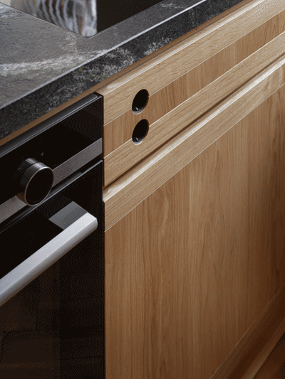 ist aus Massivholz gefertigt. Innenliegende Schubladen schaffen maximale Flexibilität und nutzen die Unterschränke perfekt aus. Kleine aber feine Details wie die integrierten Steckdosen machen das Design rund.