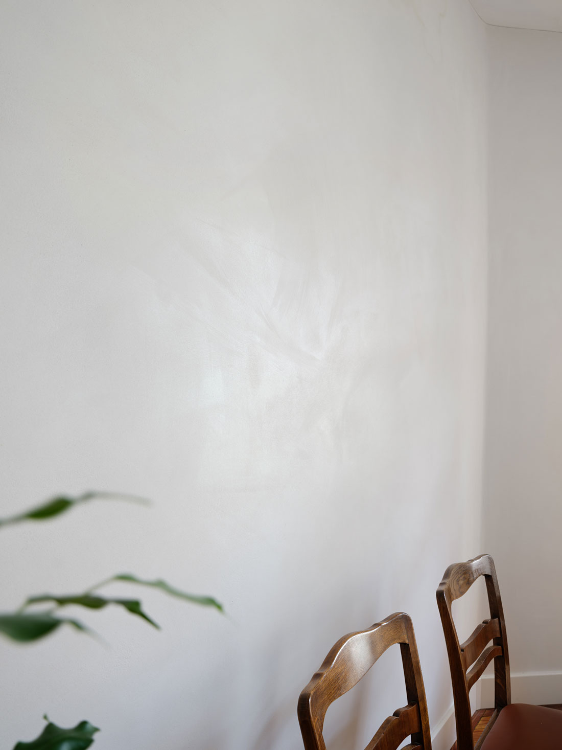 neu verputzt. Dieser transportiert die Wärme der Wandheizung ideal und moderiert dabei auch die Raumluftfeuchte und eliminiert Gerüche. Der seidige Glanz ist dem Können der Handwerker und dem fertig angemischten Lehm-Oberputz zu verdanken.